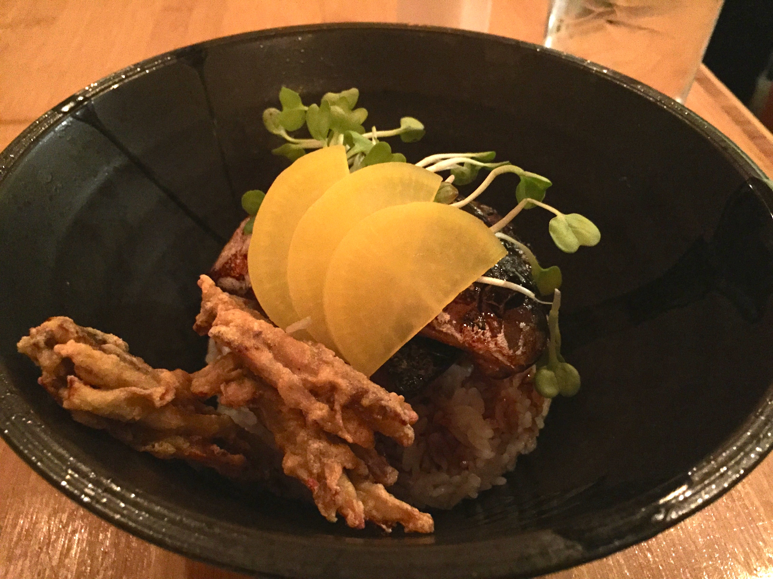 While the sushi at Arami shines, the cooked dishes are also tasty. The saba donburi consists of two small fillets, each roughly the size of a deck of cards. The grilled mackerel is meaty and has a sweet glaze. It’s accompanied by about a cup and a half of rice, every grain perfectly formed and separate but still slightly sticky. And the pickled daikon is refreshing, with the fried gobo adding a little crunch.