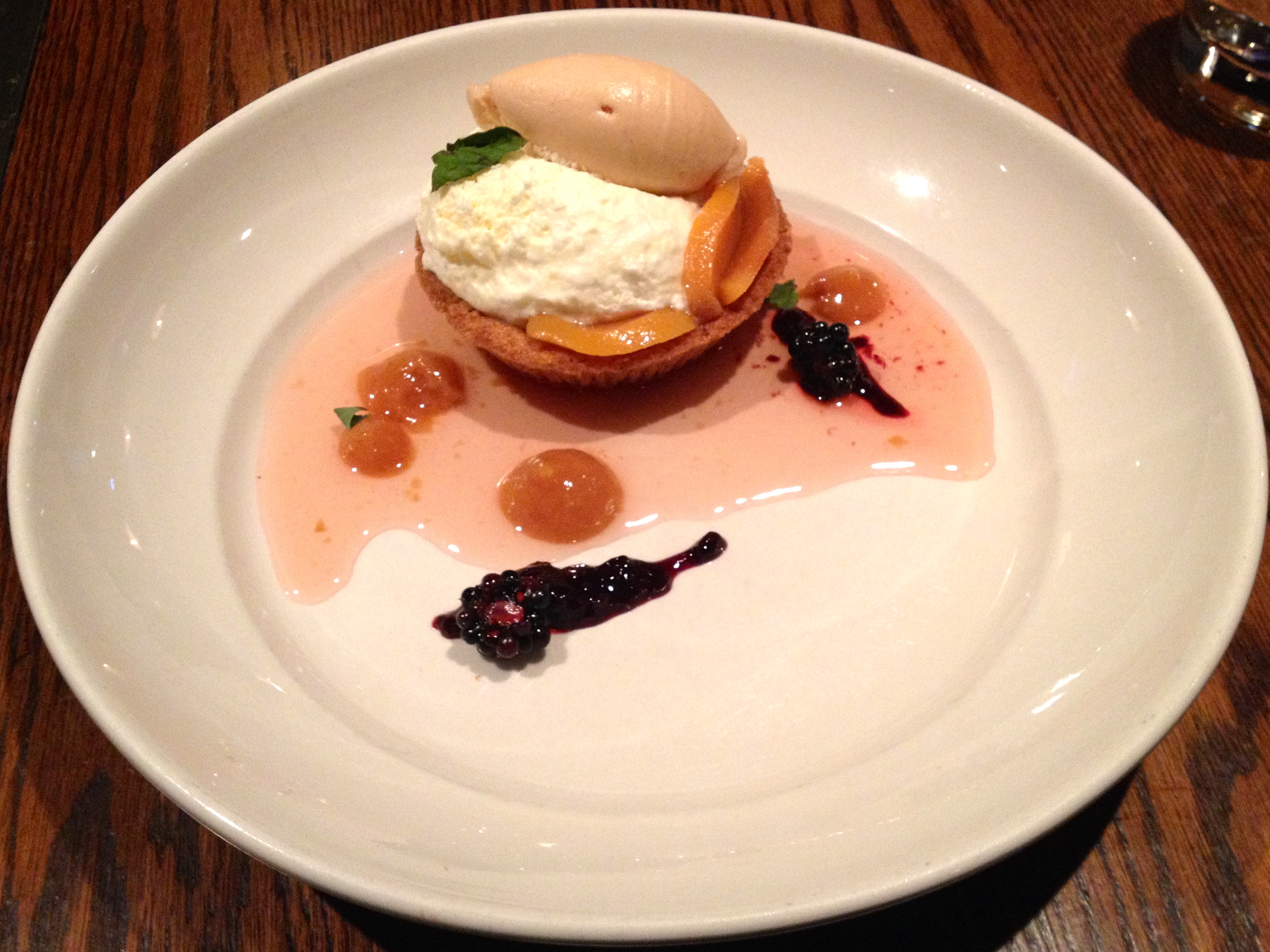 Peaches & Cream – Lemon Cream & Graham Cracker Pie, Poached Peaches, Lemon Verbena, Blackberries, and Peach Creamsicle Sherbet ($13)