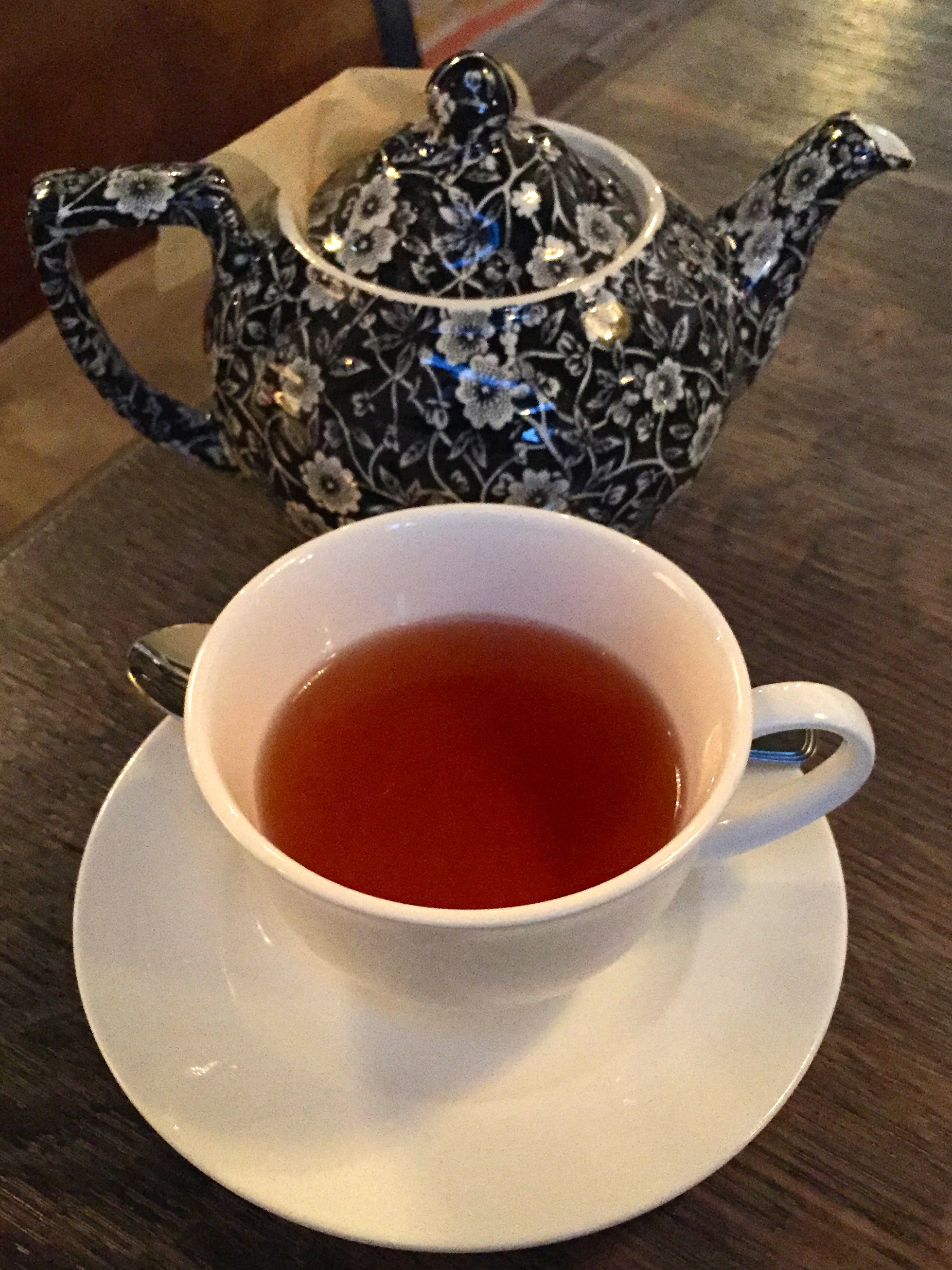 I chose the African amber tea, described as an “African roobios with lush notes of mango, vanilla and hibiscus.” It’s a deep, rich color, the taste a little fruity with an almost smoky flavor. I wasn’t offered milk or sugar, although it didn’t really need it, nor was I offered additional hot water once the pot was empty.