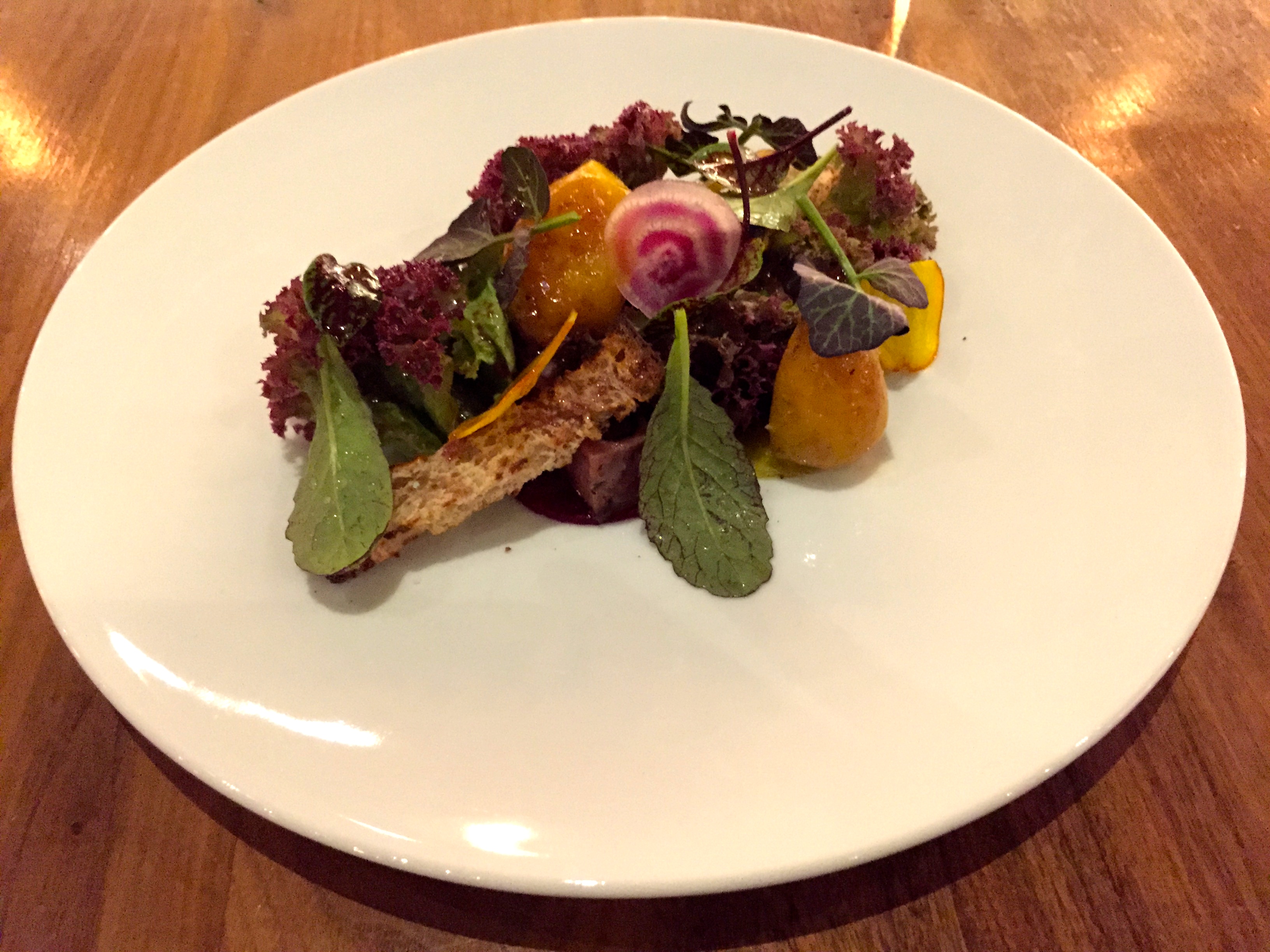 I passed on the charcuterie since they only offered a charcuterie board for two, so I chose the duck rillette as my first course. The two pieces of rillette are soft, and the greens with which they’re served are dressed with a vinaigrette, which adds a little acidity. There also small toast fingers that taste a bit like multigrain toast, even though they’re actually pumpernickel. Unfortunately, the rilette is not very flavorful. There’s a little sweetness from the beets, which are nicely cooked and tender, and it’s a pretty presentation, but it doesn’t stand out. This is particularly disappointing given that their focus is supposed to be charcuterie.