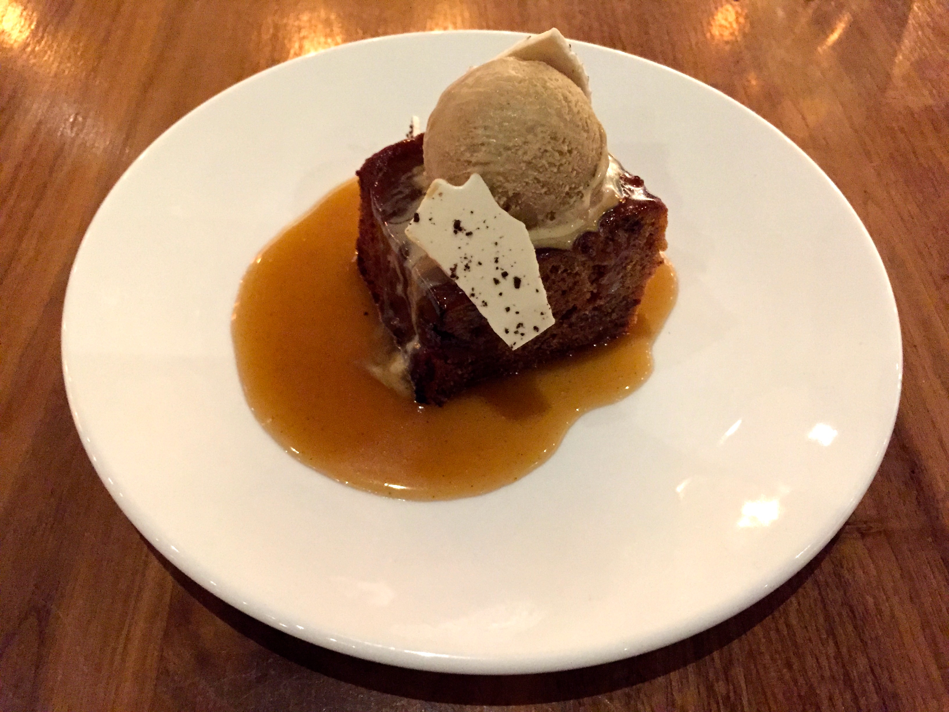 TETE Charcuterie offers a single dessert option for Restaurant Week: a sticky date cake, which is served slightly warm. The taste of the cake reminds me a bit of bran; it would almost feel wholesome if it weren’t for the butterscotch sauce. Texturally, it’s a little like a gingerbread with slightly crisp edges. I like the butterscotch, although it’s a little grainy from undissolved sugar. The ping-pong ball-sized scoop of ice cream on top is creamy and has a very distinct coffee flavor that goes nicely with the rest of the dessert. The meringue wafer garnish melts into nothing.