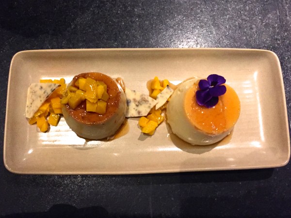 Duo de Flanes – Traditional Mexican vanilla flan and toasted pistachio flan. White chocolate-pistachio bark, honey Manila mango ($8.25)