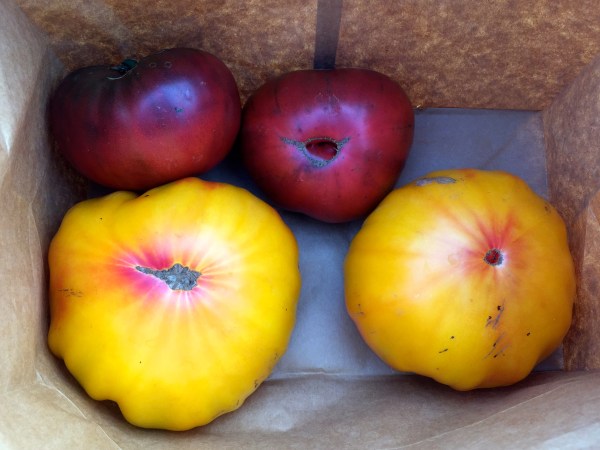 And as a bonus, although this isn’t strictly a dish, I discovered the incredible Noir de Crimee and Striped German heirloom tomatoes from the Loyola University Retreat and Ecology Campus at the Loyola Farmers Market.