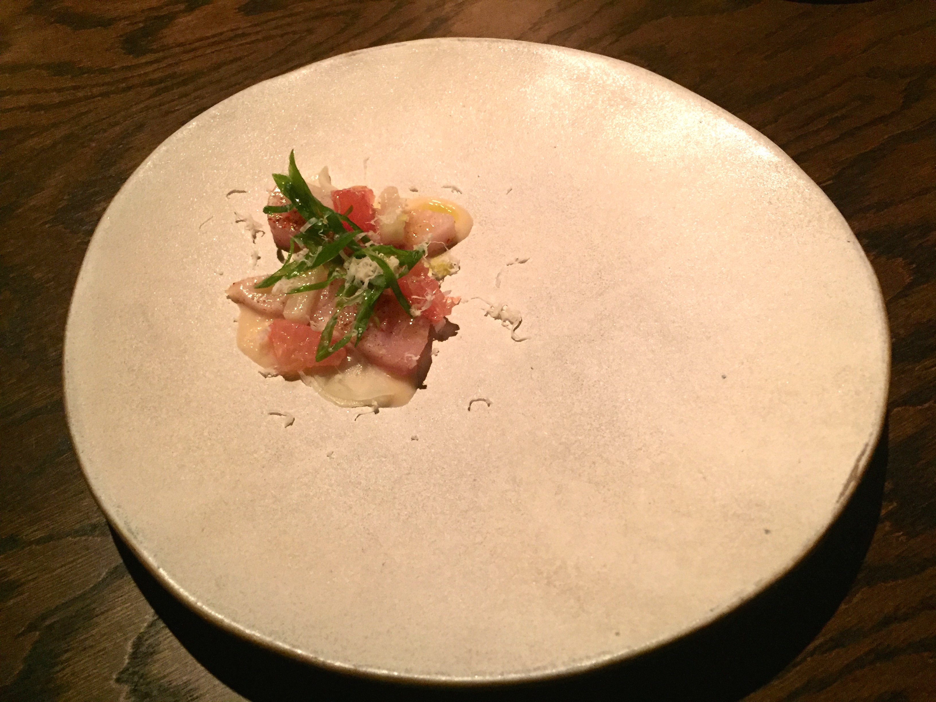 For the cold first course, I chose Boka’s marinated hamachi with grated fresh horseradish and grapefruit dashi. I like the tartness of the grapefruit, and the kohlrabi adds a nice crunch. It’s a very light dish and a refreshing way to start the meal.