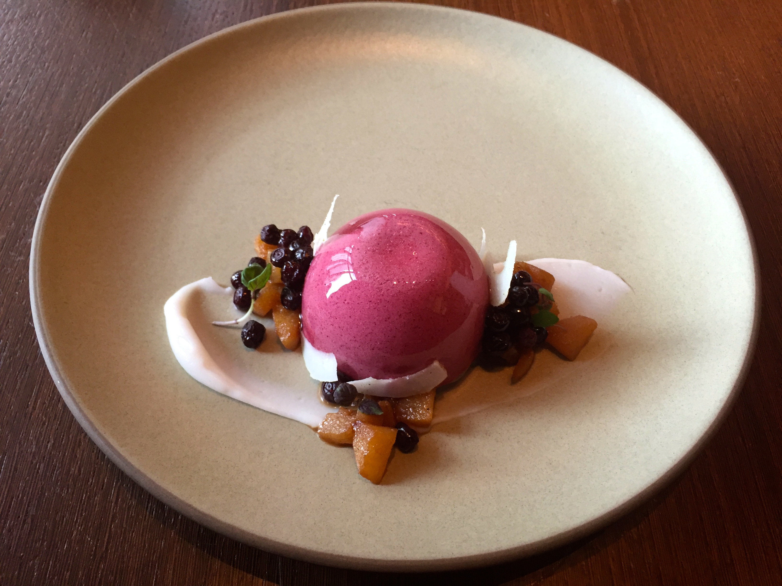 Huckleberry Mousse Bombe – Meyer Lemon Puree Core, Coriander Financier, Coconut Gel, Candied Coconut, Caramelized Pear
