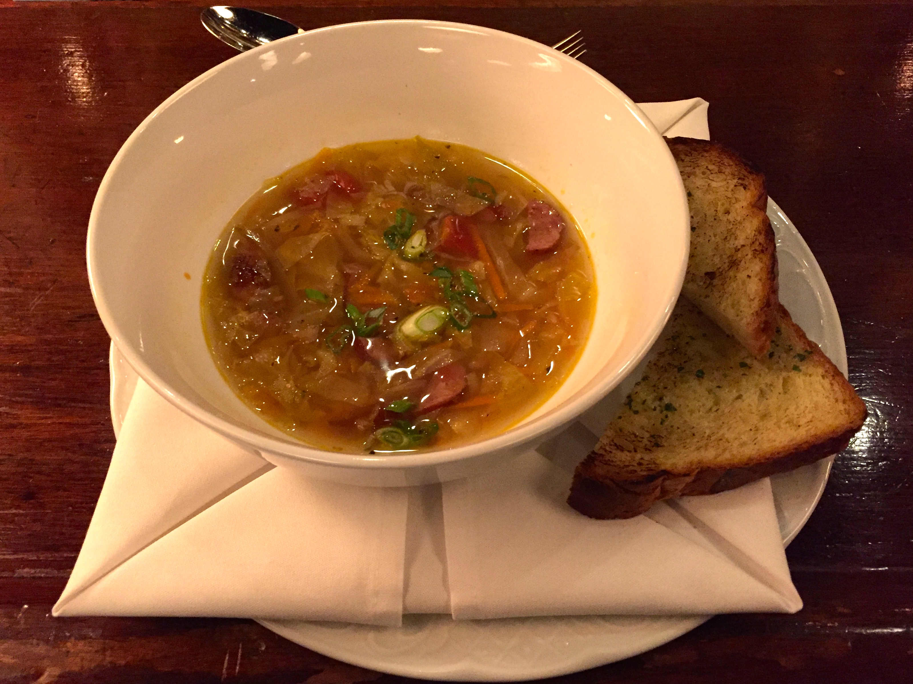 To start my meal, I chose the cabbage and sausage soup over the chicory salad. It arrived in a huge bowl, a rather salty broth tasting of chicken with chunks of mildly flavored sausage, cabbage, and tomatoes. There’s something sort of nice about the tender cabbage and meaty sausage, but it also feels like something I could make. The accompanying bread is thickly sliced yet unexpectedly delicate – airy, lightly grilled, and slightly garlicky. The garlic bread might be my favorite part of the dish.