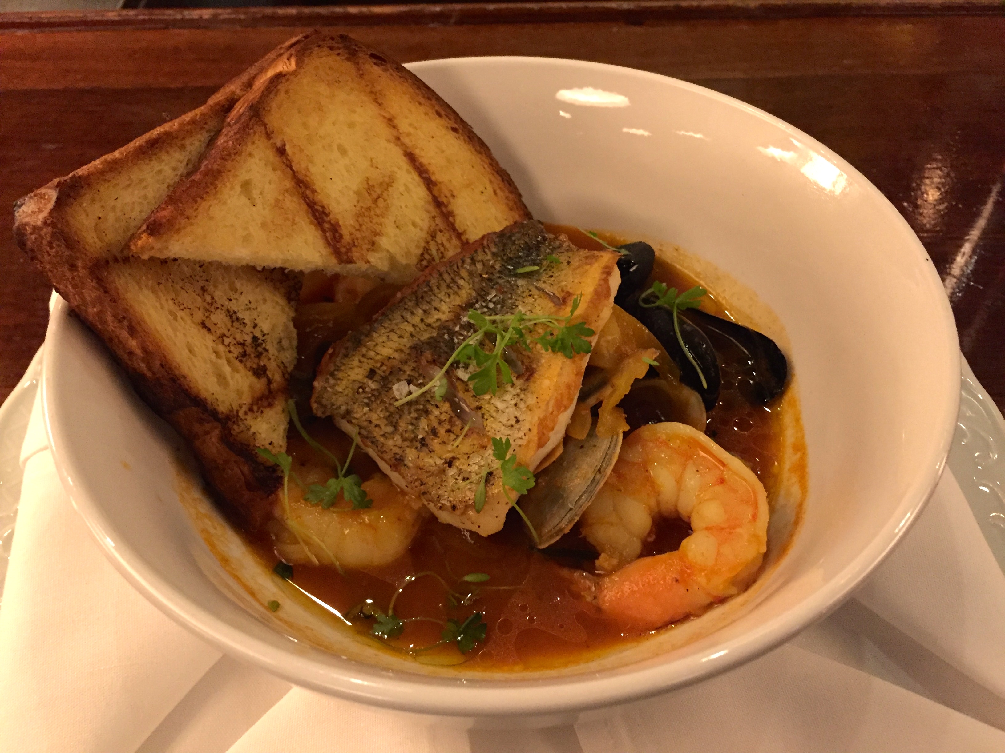 Cherry Circle Room offers three lunch entrée options – a vegetarian risotto dish; a fish dish, which I chose; and a wild boar sausage sandwich. The fish is very nicely cooked, as are the shrimp, although the fish skin could be crispier. The broth is spicier than I expected, so the saffron doesn’t come through, although the olive oil drizzled on top is very present. Accompanying the fish are three each of shrimp, clams, and mussels. Perhaps I shouldn’t have chosen two soups, but my bartender server said it was a solid progression, and I didn’t realize the entrée would be a soup. Still, it’s more flavorful and more interesting than the first soup, although it is served with more of that tasty, toasted bread, just without the garlic.
